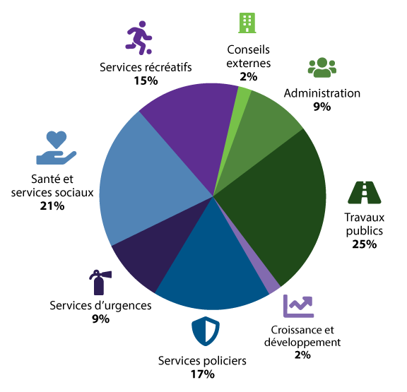 Répartition des impôts par ordre du plus coûteux au moins coûteux: travaux publics, santé et services sociaux, services policiers, services récréatifs, services d’urgence, administration, croissance et développement, conseils externes.