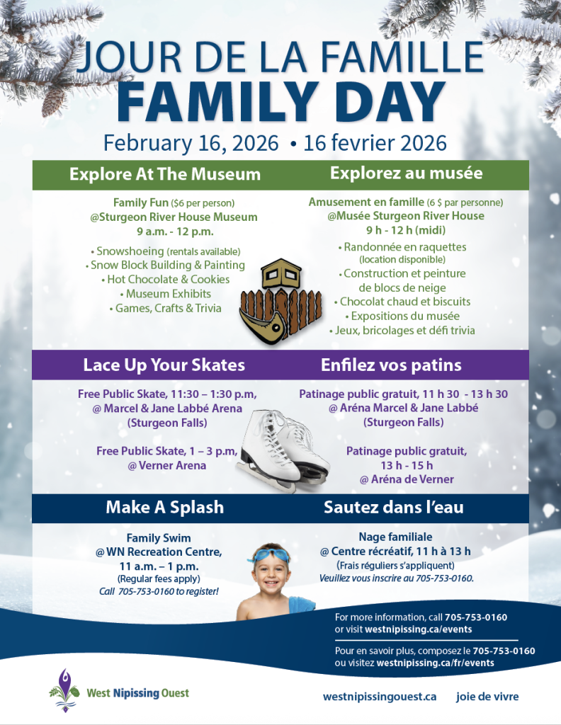 Our Community Services team is at it again, bringing a full day of fun and activities for families across West Nipissing! Whether you’re looking for outdoor adventures, skating, or swimming, there’s something for everyone to enjoy this Family Day.
