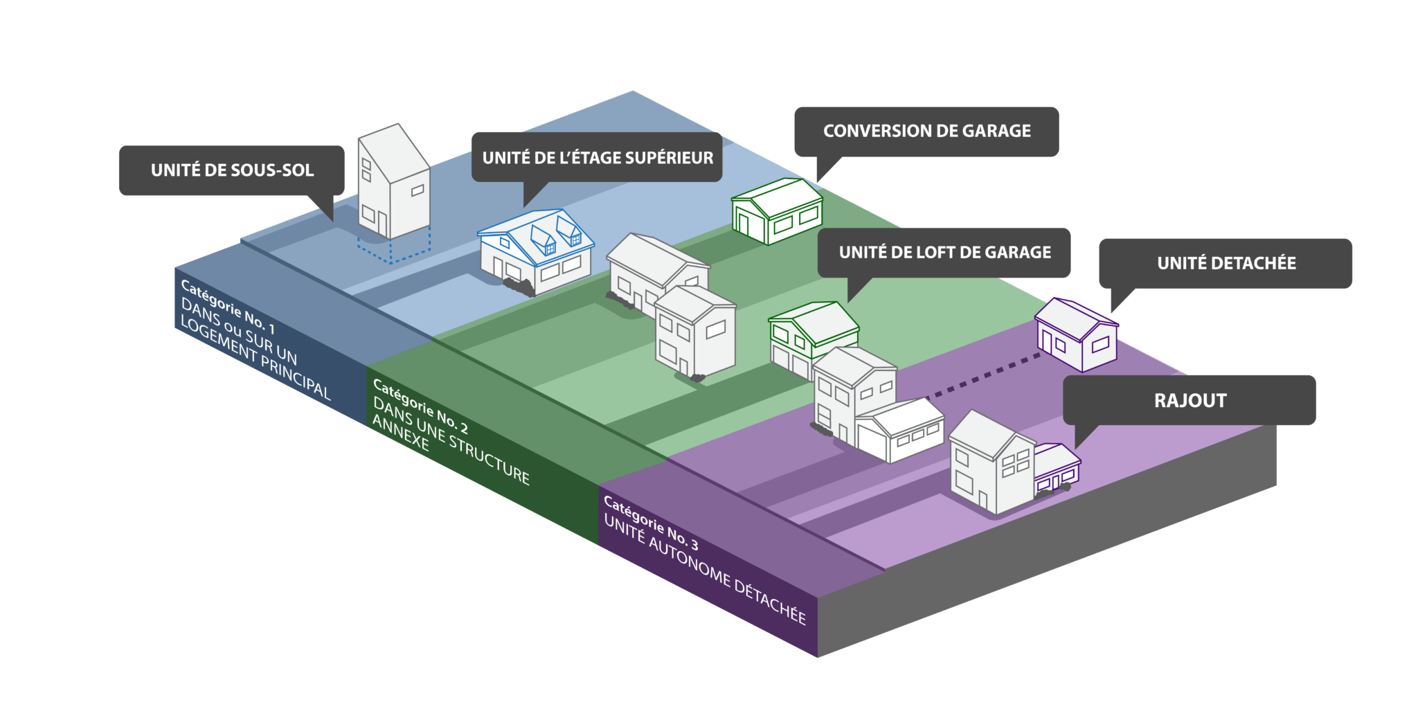 Toutes les propriétés desservies par les services municipaux et contenant un logement individuel, jumelé, en duplex ou en maison de ville sont autorisées à avoir deux unités de logements supplémentaires, en plus du logement principal. Les configurations suivantes sont autorisées :