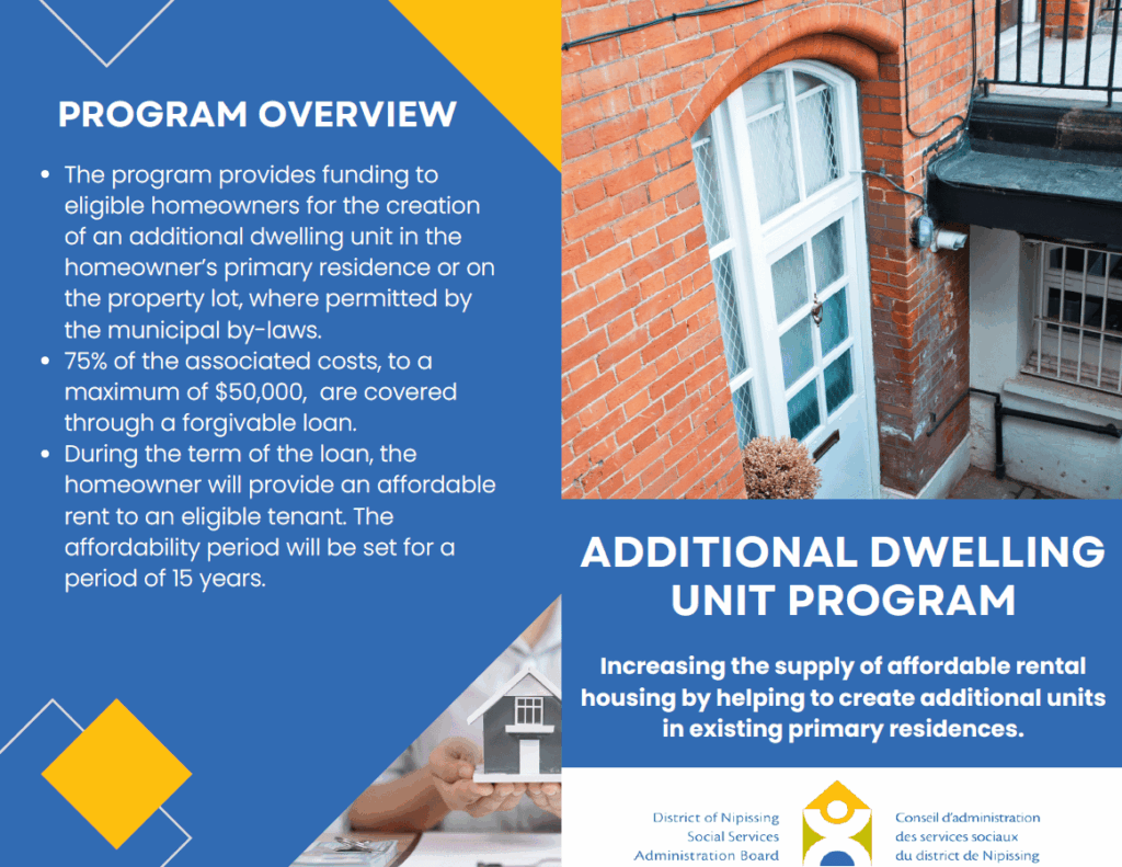 Le Conseil d’administration des services sociaux du district de Nipissing cherche à augmenter le nombre de logements locatifs abordables en aidant à créer des unités supplémentaires dans des résidences principales existantes grâce à son programme d’unités de logement supplémentaires.