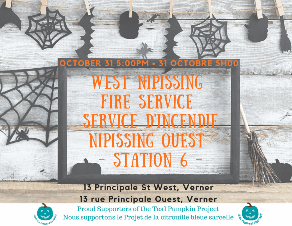 Les pompiers de la station 6 à Verner seront à leur caserne dès 17 h, le vendredi 31 octobre, pour remettre des petites surprises non alimentaire aux enfants qui passent l’Halloween en appui au Projet de la citrouille turquoise (Teal Pumpkin Project).
