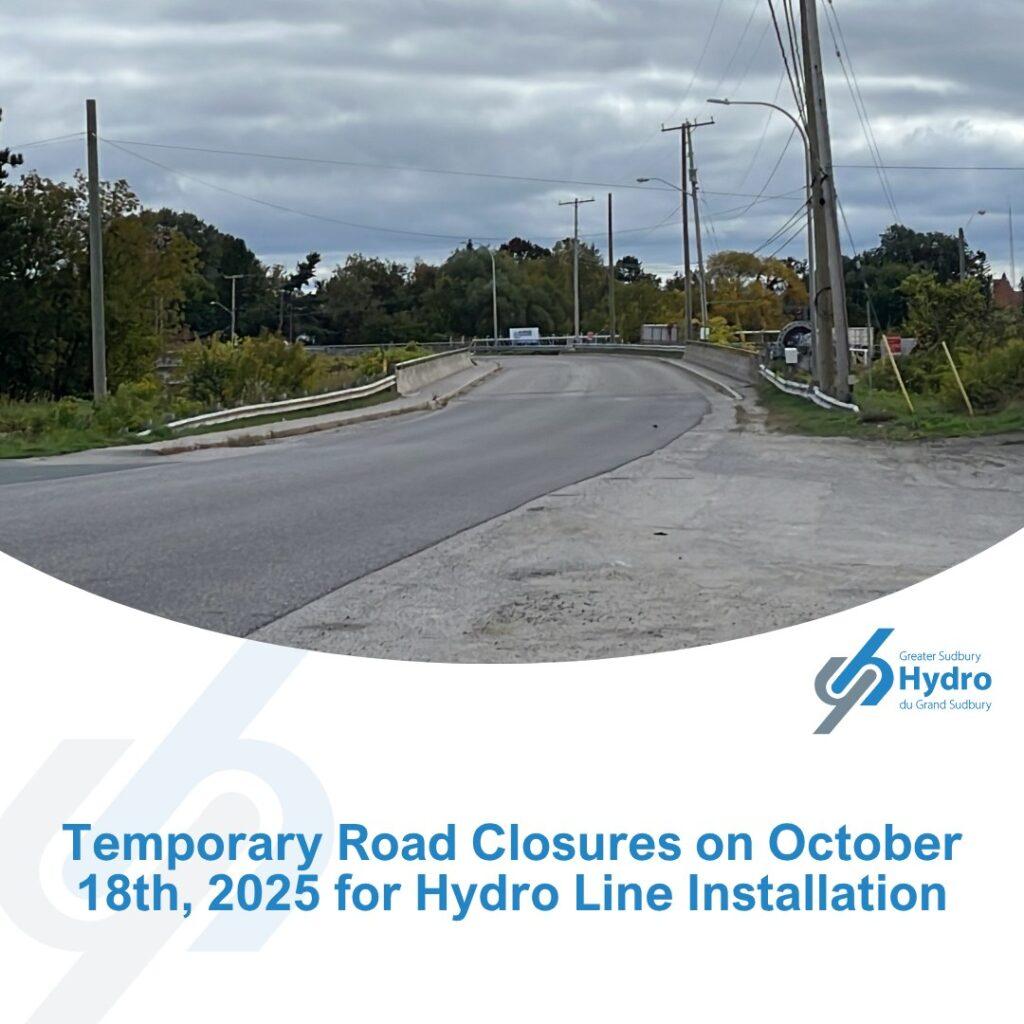 Veuillez noter que le pont du chemin Cache Bay/ la rue John sera fermée à la circulation le samedi 18 octobre 2025, de 7 h à 16 h, afin de permettre aux équipes de Greater Sudbury Utilities d’installer de nouvelles lignes électriques en toute sécurité.